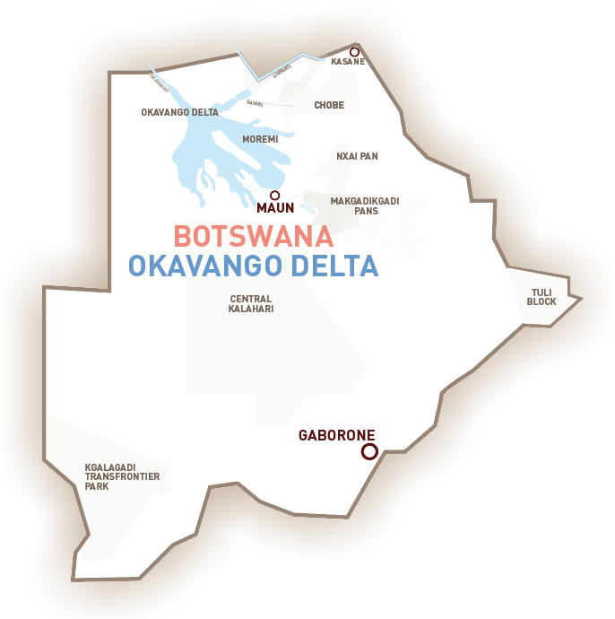 Das Okavango-Delta ist ein Binnendelta im Norden von Botswana, in dem sich ein faszinierender Zyklus von Wasser und Trockenheit abspielt. Das Flutwasser ist im Prinzip Regenwasser aus den Bergen Angolas, das sich auf einer Reise von mehreren Monaten langsam im Okavango River sammelt, sich durch den Panhandle zwängt (der sogenannte "Pfannenstiel" wo das Okavango Delta sich fächert) und dann das Okavango Delta überschwemmt. Auf der Reise durch das Delta versickert und verdunstet 90% des Wassers, speist aber auf dem Weg durch das Delta die Natur und versorgt die Tiere mit Nahrung.