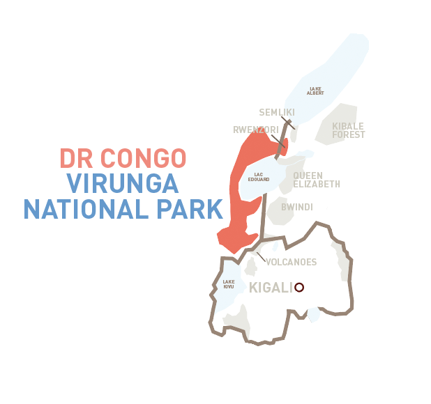 Der Virunga Nationalpark ist UNESCO Weltnaturerbe. Der Park befindet sich im Osten der Demokratischen Republik Kongo, im Grenzgebiet zu Uganda und Ruanda. Der Virunga NP ist Afrikas ältester Park und sicherlich auch eines der vielfältigsten Schutzgebiete Afrikas. Das geschützte Gebiet umfasst 7800 km2 Wälder, Savannen, Sümpfe, Seen, Täler, aber auch Lavafelder und sogar aktive Vulkane. Daneben auch die vergletscherten Gipfel der Rwenzori Berge.