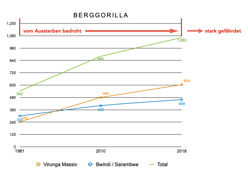 Die Berggorilla Population hat sich von einem historischen Tief im 1981 leicht erholt, insbesondere die Gruppen, welche von Rangern streng bewacht und regelmässig von Touristen besucht werden. Es besteht zwar die Gefahr, dass Krankheiten von Mensch zu Tier übertragen werden, aber der Fototourismus hat überwiegend Vorteile und generiert sehr viel Geld für den Schutz der Tiere. Der Status der Berggorillas wurde im 2018 angehoben von Critically Endangered auf Endangered, um dieser positiven Entwicklung Rechnung zu tragen.